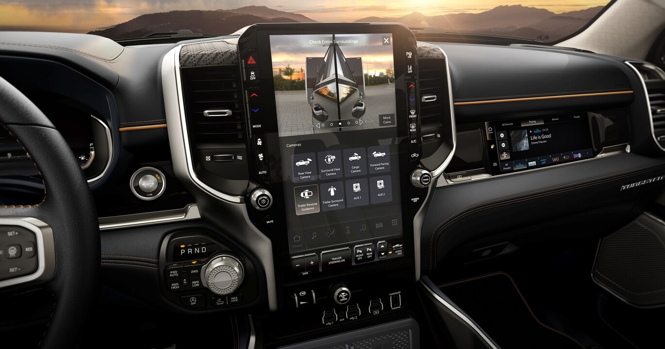Safety is standard onboard the 2026 Ram 1500, which includes standard features like adaptive cruise control, blind spot detection, lane departure warning, ParkView back-up camera, and ParkSense sensors, while advanced options include Active Driving Assist, intersection collision, traffic sign recognition, and surround view camera.